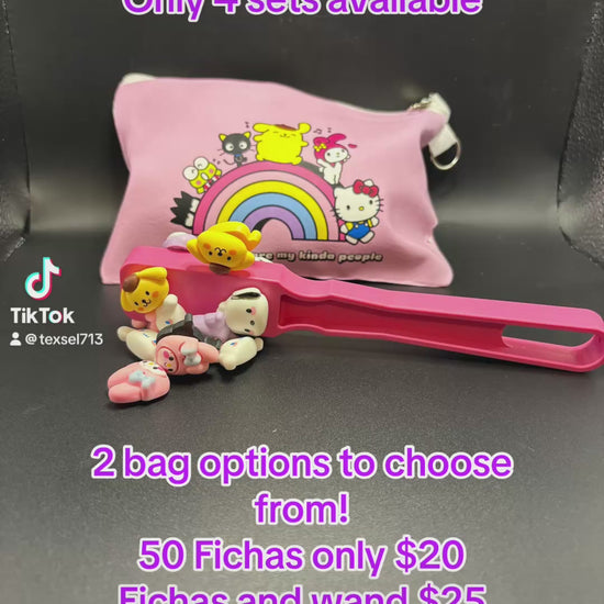 Get 50 colorful fichas for just $20, or add the wand to make it $25. Need a bag too? Choose fichas with a bag for $30, or grab the full fun set—fichas, wand, and bag—for $35. Plus, you can personalize your set by adding your name in vinyl for only $5 more.